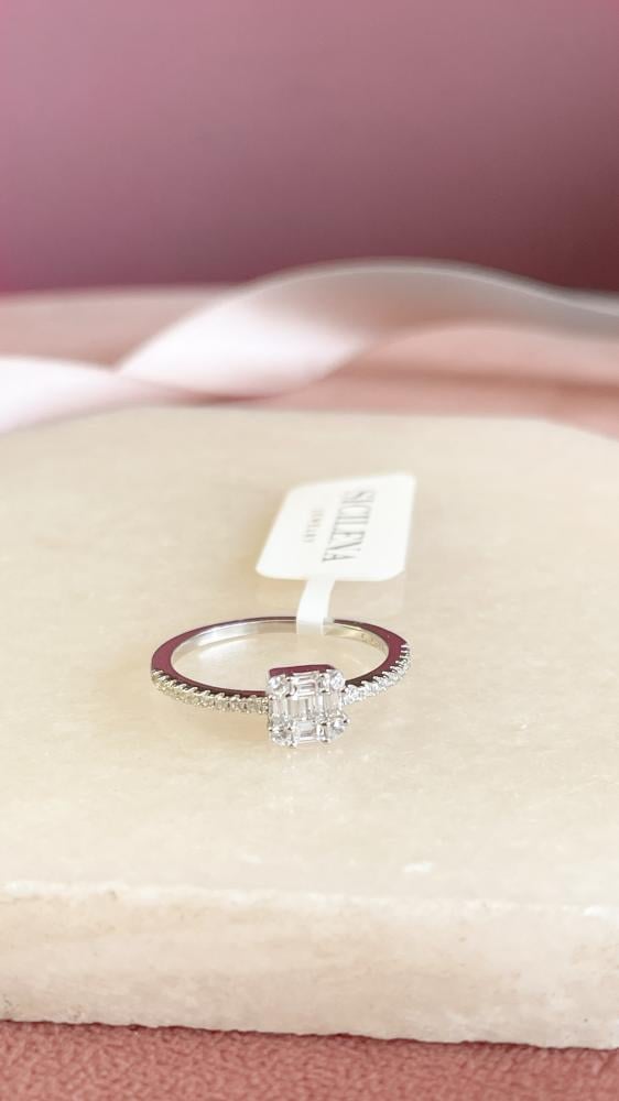 تصميمه الراقي بحجر مركزي emerald cut بلمعة هادئة وفخمة، وسير مرصوف بزركونات ناعمة، يخليه من الخواتم اللي كأنها خُلقت عشان تلبسها كل يوم وتظلي فخورة فيها.